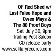 Sometime in 2006 Kristofer “Coondog” Kunzeman (guitar, lead vocals) looked to memories of his granddad’s traditional country and bluegrass band for inspiration after the demise of his latest metal/punk group. Fellow bandmate David Lawson got a doghouse bass and soon Quincy Watson joined on mandolin to help build the Ol’ Red Shed. Area pickers such as Luke Turasky, Brad Alan and Mike Smith sat in until the current lineup of John Crowe (banjo) and Dan Grover (lap steel, guitar) solidified, with Josh Parr (fiddle) as a frequent guest. Undertones of metal and punk laced through the trad-country sounds evolving into what Coondog calls “Riverbilly Barncore” to let folks know “pop country crap ain’t what this is about” and to pay homage to their Mississippi River roots. After getting substantial Internet radio airplay, the group signed with Josh Nutting’s fledgling Solitary Records of Chicago to release Country Fury as the band’s first record. Future plans include a Norb’s show on Aug. 20, songwriting for the next record and touring when possible. See also