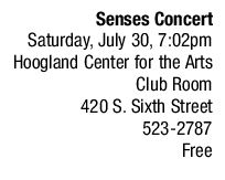 Local five-piece Grammy-nominated band David Cain & Senses performs a free concert that includes video and animation at the Hoogland to raise money for the center through donations. Senses might be categorized as playing new wave, ambient, or contemporary jazz music. The concert is titled Soundadelic, but front man and vocalist/saxophonist David Cain always seems to break out of any confine. In fact, he claims that you’ll hear “sounds like you haven’t heard before” as he, and electronic and synthesized guitarist Howard Freitag, create sounds from their computers and midi-keyboards as well. They are joined by David Hoffman, who played with Ray Charles for more than 13 years on trumpet and keys; Jim Cloney, playing the four- and six-string bass; and Michael Wall on electronic drums and percussion. The group will film this concert for a PBS live concert video. Be part of the experience.