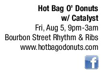 BAND SPOTLIGHT | Hot Bag O’ Donuts and Catalyst Bourbon Street Rhythm & Ribs, better known to old-timers as Bruce’s Tavern, recently began hosting rock bands every Friday and Saturday night. This Friday becomes more than a wild, rocking show and turns into a fundraiser with the $5 cover going to assist the Access 4 Producers Group in setting up a new production studio space. Plus at this performance you get two bands for the price of one donation as HBoD and Catalyst interchange members like nobody’s business. Assorted band mates include, in no particular order and in one band or the other or both, Craig Ripka (drums), Kate Johnson (singer), Erin Baker (percussion), Ted Keylon (singer and ukulele), Damion Davis (drums), Peyton Hagar (guitar), Casey Cantrall (bass and guitar) and Zach Eymann (keyboards, harmonica and Theremin). Promoters for the show make the bold claim of, “This will be a DANCING event!” and offer the recommendation to, “Bring your dancing shoes!!!!” So, if you will, please come dance for a just cause and just because. See also