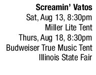 Originally conceived by Billy Bacon in 1993 as a Latin percussion-oriented group focusing mainly on material from Carlos Santana with a few cool covers by the band War, the Screamin’ Vatos have always been local favorites. With an average of 8 to 10 members in the band at all times, including percussionists and horn players accompanying the usual guitar, keyboards, bass and drum setup, many an area musician has passed through the ranks of the Vatos. The current lineup consists of Bacon, along with Kenny Young, Larry Harness, Ed Halerewicz, Ed Fliege, Tim Lacy, Don Udey, Bill Cope, Dewaine Ellis and E.J. Lynch, with Lynch officially the 50th musician to join the band. This year brought a set list overhaul with a “new focus to incorporate a wider array of popular Soul and R&B tunes” including tunes from Earth, Wind & Fire, Sly and the Family Stone and Chicago to complement the original Santana tribute idea. Catch them at summer lake parties and other places large enough to accommodate the expansive and entertaining group.