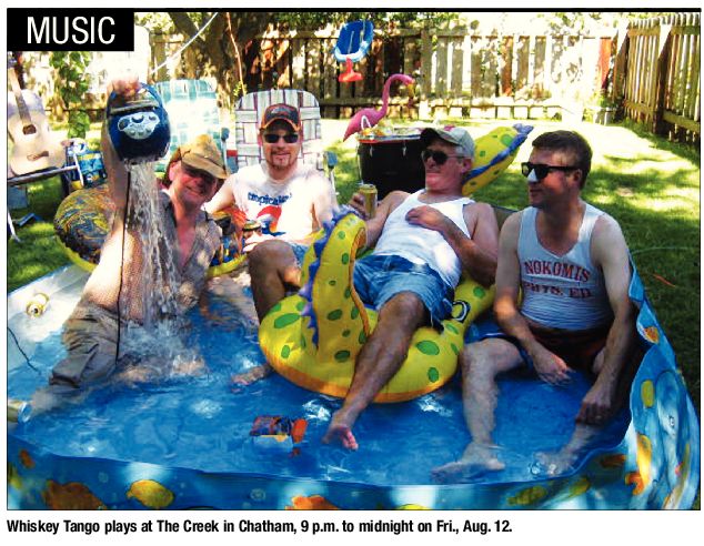 Whiskey Tango, a fairly recently formed local band featuring Bill Steele and Cliff Edwards from the Skruz, Doug Gholson from Mr. Opporknockity and Larry Caulk from Big Fur, Moonlight Rhythm Rangers and the Blue Ribbon Revival, claim their music has “redneck style” and is “Hell Yeah Yee Haw rockin roll” and who would deny that? The guys got together for fun at a party, had a blast and then became a band, just like that. Check them out at The Creek in Chatham, 9 p.m. to midnight on Fri., Aug. 12.