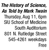 Twain scholar and impersonator Warren Brown, winner of the Studs Terkel Humanities Service Award for more than 1,000 presentations as Twain, brings the Midwest writer to life at Southern Illinois University School of Medicine on Aug. 11. Brown shares Twain’s insights from Diaries of Adam and Eve, friendships with inventors and thoughts about Galileo and Newton. The 16th annual Emmet F. Pearson Memorial Medical History Lecture is sponsored by the SIU Department of Medical Humanities and the Friends of the Pearson Museum and supported by an Illinois Humanities Council grant. See also