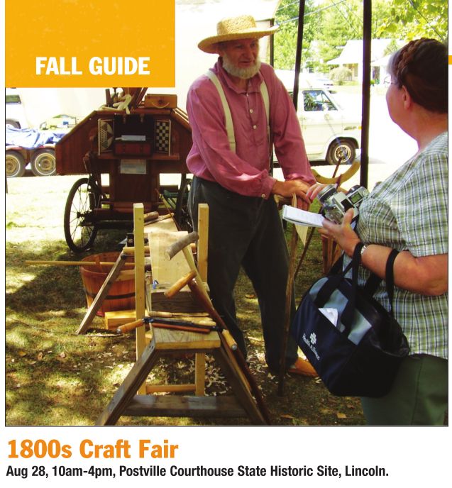 1800s Craft Fair Aug 28, 10am-4pm, Meet Abe and Mary Lincoln, watch craftspeople demonstrate variety of trades, live period music, tours and more. Free. Postville Courthouse State Historic Site, 914 Fifth Street, Lincoln, 217- 732-8930.