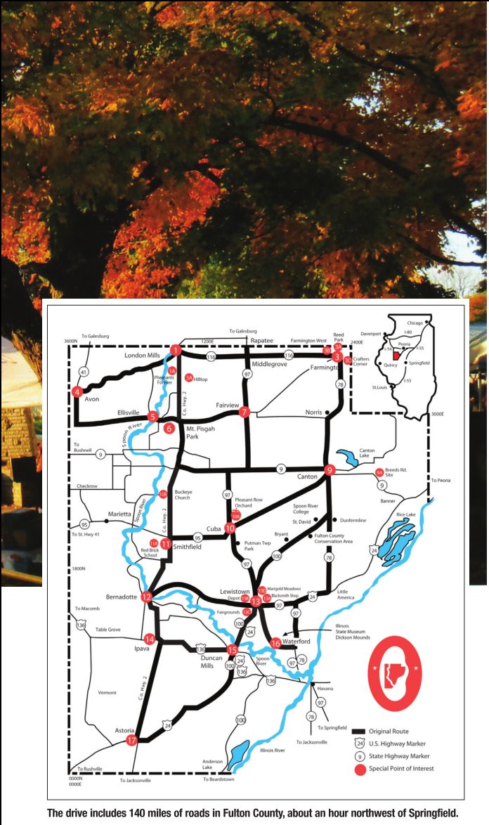 “Lewistown was the home of Edgar Lee Masters through his younger years and the atmosphere of Lewistown undoubtedly had an inspirational effect upon Masters that led to the Spoon River Anthology being written by Masters. Lewistown has a rich history associated with railroading in Fulton County. Restoration has commenced and continues on both the old Fulton County Narrow Gauge Railroad Station and the Cedar Street Station which served Lewistown for many years. The restoration and continuing operation of the Rasmussen Blacksmith Shop Museum is a major attraction for tourists in Lewistown.” During the drive, Lewistown hosts Spoon River Anthology readings. Check out the map to see just where you wish to stop, then plan accordingly. Keep the upcoming holidays in mind while shopping and enjoy all the beauty that fall and Fulton County have to offer. For more information go to the website, www.spoonriverdrive.org, or write to the Spoon River Valley Scenic Drive, P.O. Box 525, Canton, Ill., 61520 or call 309-647-898 for more details. You may also email [email protected]. See also