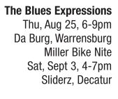 Four years ago Adrian Muex knew he wanted to start a blues band. His previous live music experience entailed mostly church performances as a choir director and gospel singer influenced and inspired by his father, Alfred Muex, and other members of his musical family, so deciding on a band name and blues style was a new experience. “I wanted to express the blues but didn’t know how I wanted to approach the blues so I said, ‘The Blues Expressions’ would be a good name. So here we are.” Joining bassist/manager Muex in the group are stalwarts of the area live music scene including Tony Young, Frank Parker, Santiago Roberts, Sr., Charles Tiner, Dion Doss and one of best blues vocalists and guitarists around, K.P. Pollard (also of Stone Cold Blues Band). Muex stays busy with another group of his making called Smoothtimes (see them Aug. 26 at Brookhills Golf Club, 8-11pm) featuring Marcus Taylor, C Lee and Decatur vocalist Jacki Flinn, plus some members of the Blues Expressions.