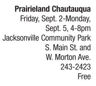 “Heroes of the Civil War” is the theme of this year’s Prairieland Chautauqua, a four-day fest of stories, songs and suppers under the big tent in Jacksonville Community Park. Organizers are bringing in talent from Illinois, New York and Ohio to portray famous men and women of the Civil War, and others who will discuss topics such as Illinois experiences during the war, or sing songs of the Civil War. Some of the performers include storyteller Brian “Fox” Ellis of Peoria, African-American storyteller Shanta Nurullah of Chicago, Re-enactor George Dauler of Ohio, and singer/songwriter Barry Cloyd of Peoria. If you plan to have dinner at the event, reservations need to be made at least a day in advance, so make sure to phone 675-2720 or email [email protected]. You can also make them a day ahead at the check-in table Friday, Saturday or Sunday. Dinner is $10. See also