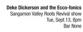 Hailing from nearby Columbia, Mo., Deke Dickerson has toured the world as an entertaining guitarist and developed an international career as a journalist/historian in the arena of American roots music. No stranger to Springfield, Dickerson was an early participant in the Sangamon Valley Roots Revival and continues to stop by the capital city when his incessant touring brings him back to our neck of the woods. His latest record, The King of the Whole Wide World, contains a few killer rockabilly songs, the genre he is best known for performing, but overall the album is a tour-de-force of original American music forms. Song styles include bluegrass, rhythm and blues, Western swing, Memphis soul and doo-wop, showcasing the varied and intense talents of this true American music treasure. All that, and he’s a barrel of monkeys to see perform, playing a show filled with phenomenal music backed with surefire showmanship. Yup, you should come see ol’ Deke behind the guitar for sure with Chris “Sugarballs” Sprague, and Jimmy Sutton as the Ecco-fonics. See also