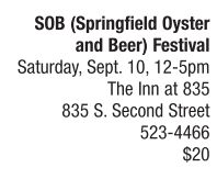 This craft beer and oyster festival at The Inn at 835 features more than 50 local and nationally-recognized craft beer vendors such as Flossmoor Station Brewing Company sampling Rail Hopper IPA, Pullman Brown, Stationmaster Wheat; and Springfield’s Prairie Schooner Brew Club sampling Maple Wheat, Mt. Dew Brew, Pecan Brown and an Oyster Stout beer. Admission gets you a tasting glass and five tickets. Additional sampling tickets will be available. There are also other seafood selections and traditional grub, plus music by Kung Fu Trio and Thornhill. All profits are donated to a charity, with four in the running – you can vote for your favorite online at the SOB Festival website at www.sobfestival.com.