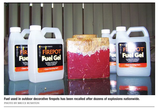 On Sept. 1, the U.S. Consumer Products Safety Commission announced that Bird Brain and eight other manufacturers of gel fuel for firepots had agreed to a voluntary recall. The commission reported 65 explosions which caused two deaths and burns serious enough that 34 people were hospitalized.