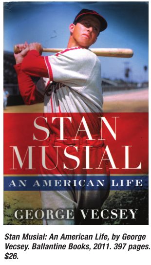 The author of Stan Musial, An American Life, veteran New York Times sportswriter George Vecsey, was once a religion reporter for that paper. So it’s not surprising that the book focuses on Musial’s personality rather than on his baseball prowess. The statistics are amazing: 7 batting titles; 3,630 hits (1,815 at home and 1,815 on the road); 475 home runs; 724 doubles; 177 triples; 1,951 RBIs; only 696 strikeouts in 10,972 at-bats, a 6.3 percent ratio (Babe Ruth 15.8 percent, Reggie Jackson 26.3 percent); Hall of Fame on the first ballot.