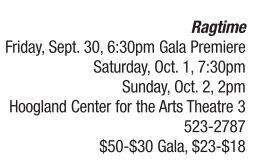 Joshua Ratz, Mary Kate Smith, Doug Hahn (standing), Gerrah Caldwell and Joel Tinsley-Hall (seated) are just a few of the dazzling local talent in a cast of more than 50 performing the Tony-award winning musical Ragtime at the Hoogland Center for the Arts. Go on a journey with three families as they confront wealth and poverty, freedom and prejudice and hope and despair in the early 1900s. Directed by Matthew Vala, choreographed by Gary Shull and produced by Gus Gordon, the production includes a full orchestra. The Gala Premiere on Sept. 30 features pre-performance activities and a post-show reception.
