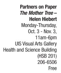 Illinois State Museum, Prairie Art Alliance, Springfield Art Association, University of Illinois at Springfield and Robert Morris College have bound together to present a citywide exhibition, Partners on Paper, through the month of October. UIS Visual Arts Gallery offers the paper work of Oregon artist Helen Hiebert, featuring The Mother Tree, a life-size handmade paper dress with crocheted threads extending from its base as roots. Visitors can add their own words to the exhibit on notepads. An opening reception is Oct. 21 from 4:30- 6:30 p.m. at which time all organizations will host receptions simultaneously so patrons can gallery hop to see all the paper art at each venue. A workshop with Hiebert takes place at SAA on Oct. 22, and other workshops at various locations are planned. Visit individual sites for more details or go to Partners on Paper on Facebook. See also