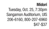 Violinist Midori performs at Sangamon Auditorium Oct. 25. She is joined on stage by Pianist Özgür Aydin. On the repertoire for the evening: Mozart: Sonata in E-flat Major K.380; Shostakovich: Sonata Op.134; Schumann: Sonata in A minor, Op.105; and Schubert: Fantasy in C Major, D.934. Sometimes the beauty of a musician as a human being translates into their music, and the result is an exquisite experience. Midori is one such musician. With more than a quarter century of know-how and international touring (14 countries this year alone), this LA-based artist continues to push out performances while supporting youth around the world through several associations that she created. In addition she has served as a United Nations Messenger of Peace for the last five years. She is also strings department chair at University of Southern California, and has bachelor’s and master’s degrees in psychology. Visit Midori’s website at www.gotomidori.com to read her interesting writings about composers, her travels, living green and more. Look under the listings “Random Musings” and “Music Notes.” The concert is sponsored by WUIS Public Radio. See also