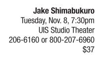 Here’s a guy who plays ukulele like no one else. Witness Jake Shimabukuro’s amazing skill at the University of Illinois Springfield Studio Theater on Nov. 8. All Music Guide compares Shimabukuro aptly to other masters-of-their-instruments – Jimi Hendrix on guitar and Miles Davis on trumpet. The Hawaiian musician’s dynamics and rhythms translate into tunes that you never thought you could hear on a small instrument and sound so great. Bohemian Rhapsody is one such song. Another is Leonard Cohen’s “Hallelujah” on Shimabukuro’s latest album, Peace Love Ukulele. The rendition is moving and majestic, making the ukulele sound like a cross between a harp and classical guitar. A few awesome performances to check out online are on Rolling Stone under “Videos” then “RS Live Exclusive Performances;” Jimmy Kimmel Live at jakeshimabukuro.com; and While My Guitar Gently Weeps on YouTube. Jake was much younger looking on the YouTube video that helped catapult his career to the heights it is at now.