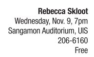 Rebecca Skloot is one of the younger chicks in the henhouse, but her debut book proves she’s one of the smarter chicks in the coop. The Chicago award-winning science writer, now New York Times bestseller author, will talk and sign books at Sangamon Auditorium, UIS, Nov. 9. Skloot’s work, The Immortal Life of Henrietta Lacks, is the intriguing story about ethics, class, race and medicine. It tells of a poor, black woman living in the 1950s whose cells were harvested for science and became the instrument of major medical advances and discoveries. The woman, Henrietta Lacks, and the annals of history never knew this fact, nor did her family until recently. The book has won numerous awards and will be made into an HBO movie by Oprah. The event is free. Tickets are available from the auditorium ticket office. The Friends of Brookens Library, Memorial Medical Center, The Illinois Humanities Council and the UIS Engaged Citizenship Common Experience (ECCE) Speakers Series are sponsors. See also