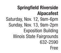 The public, especially families, are invited to the Springfield Riverside Alpacafest Nov. 12-13 at the Illinois State Fairgrounds. All weekend you can watch the competitive show as over 150 alpacas from Illinois and surrounding states are judged. See and pet an alpaca and visit with the folks raising them. Browse the vendors selling alpaca products and other items. Featured is designer Helen Hamann, a Peru native and internationally known knitwear designer with designs in Saks Fifth Avenue, Bloomingdale’s and more. A free fashion show takes place Saturday around 6:30 p.m. upstairs in the mezzanine. Dinner is available by Poe’s Catering at 6 p.m. Dinner tickets should be purchased in advance at the number above for $12. A few will be available at the door. This event is hosted by three local farms: Alpacas of Indian Point Hills, Autumn Sky Alpacas and North of The Rock Alpacas. See also