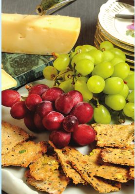 • 1/3 cup olive oil (regular – not extra-virgin) • 1 cup warm water • ¼ cup black sesame seeds (see note) • 1 cup chopped, roasted, salted pistachio nuts (about 1 1/3 cups whole) • Coarse sea salt • Brie, red grapes and/or other fruit. 1. In an electric-mixer bowl stir together 1 1/4 cups all-purpose flour, whole-wheat flour, sugar, salt, chile powder, cumin and paprika. Add oil and water and beat at medium speed for 30 seconds or until a soft dough comes together. Beat in sesame seeds and pistachio nuts. Remove dough from mixer and separate into four balls; let rest 30 minutes. 2. Lightly flour a work surface. Roll out one dough portion at a time to a large sheet less than 1/8-inch thick. Lightly sprinkle with sea salt. Cut into 16 to 18 crackers or shapes you prefer. Gently lift onto baking sheet lined with parchment paper. Bake in preheated 400 F oven for 11 to 15 minutes. Start checking after 11 minutes; crackers should be golden brown on the edges and lightly browned in the center. Remove. Cool on wire rack. Makes about six dozen crackers. Note: Black sesame seeds are available in Asian sections of supermarkets. See also