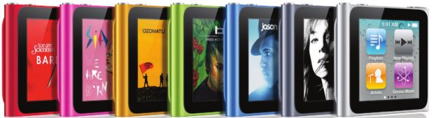 The 0.74-ounce nano packs touch-screen controls and up to 24 hours of audio playback into its roughly 1.5-inch square design. In addition to their mp3 collection, users can tune into FM radio or track their daily steps on a pedometer. A clip makes it easy to take on-the-go for a commute or for a workout, as it also syncs with the Nike+ iPod Sport Kit. The nano is available in seven colors.