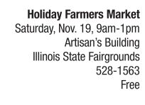 For those missing the downtown Farmers Market, the Holiday Farmers Market takes place Saturday, Nov. 19 at the Artisans Building on the Illinois State Fairgrounds. All your Thanksgiving dinner needs can be found here: meats, eggs, cheeses, veggies, Illinois wine and more. You can also purchase holiday gifts, hot drinks and lunch. The market is sponsored by Illinois Department of Agriculture, Illinois Grape Growers and Vintners Association, Slow Food Springfield, University of Illinois Extension and Illinois Stewardship Alliance. Enter gate 1 and follow the signs to parking. A map and more details can be found at www.ilstewards.org. The next market is Dec. 17.