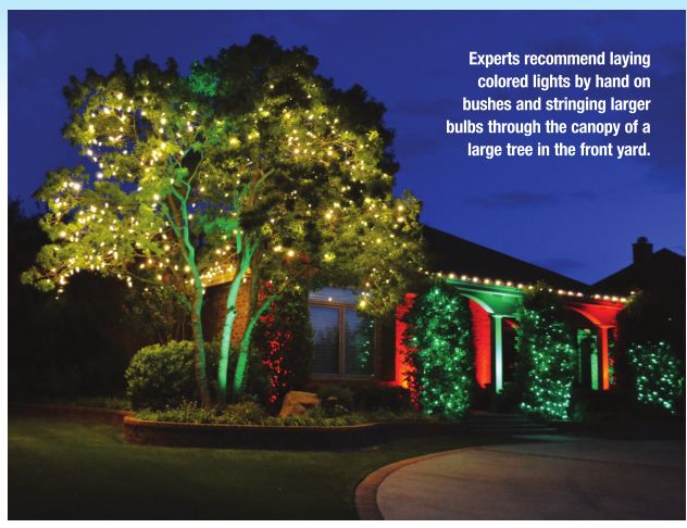 Clear lights remain the most popular choice in outdoor holiday decorating for roof and window lines, but shrubbery is the place to use color, Stephens says. Setting up a pattern of clear and colored lights works well, with every few sections changing to green or red. “It’s a popular place for people to work color back into their display,” he says.
