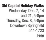 Join Mayor Mike Houston, city leaders, Land of Lincoln Chorus and others at the lighting of the downtown holiday tree Dec. 7 at 5:30 p.m. on the Old Capitol Plaza, Sixth and Adams. The ceremony kicks off the Old Capitol Holiday Walks, evenings in charming downtown offering a winter wonderland of shopping, entertainment, displays, horse-drawn trolley rides, prizes, specials, a Santa House for the kids and more. Historical sites such as the Lincoln-Herndon Law Office and the Old State Capitol will also have activities. Meter parking downtown is free after 5 p.m. The underground garage under the Old State Capitol will be open until 9 p.m. and costs 75 cents per half hour. The walk is presented by St. John’s Children’s Hospital in partnership with Downtown Springfield, Inc. and the City of Springfield. See also