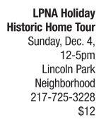 Lincoln Park Neighborhood Association holds its Holiday Historic Home Tour Sunday, Dec. 4 on the north side. Five homes built from the 1870s to the early 1900s will be decorated in holiday finery and open to guests. The tour benefits the LPNA and Northside Community Children’s Library. Tickets can be purchased at Noonan’s True Value on North Grand Avenue or at each home the day of the tour. Homes are located at 1330 N. Third, 1460 N. Eighth, 1419 N. Fourth, 1475 N. Third and 1505 N. Eighth. LPNA was founded in 2004. Neighborhood borders extend from Third Street to the west, Eighth Street to the east, Black Avenue to the north and the north side of North Grand Avenue. See also