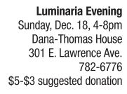 One of the best times to see the Dana-Thomas State Historic Site is during the holidays and especially at the popular Luminaria Evening, set for Sunday, Dec. 18, from 4-8 p.m. The recently remodeled home will glow with approximately 1,000 luminaria lining the sidewalks and ledges of the 12,600-square-foot structure. Tours during the Luminaria Evening are silent except for live music performed in the house. The home will remain decorated for the holidays until Dec. 31, with tours Wednesday through Sunday from 9 a.m. to 4 p.m. Tour donations are suggested at $5 for adults and $3 per child. The site will be closed Christmas Day and New Year’s Day. The Illinois Historic Preservation Agency sponsors holiday events at the home. See also