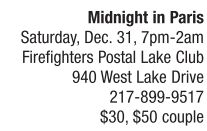 Take a trip to Paris this New Year’s Eve with the folks at the Firefighters Postal Lake Club located on Lake Springfield. The club has an evening of food and music and ambiance planned so you’ll feel as if you hopped the pond to that romantic city where everyone yearns to visit. Complete with Eifel Tower and French hors d’oeuvres (and American hors d’oeuvres for more picky eaters) the spread begins at 8 p.m. The band KFD takes the stage at 9 p.m. A flat screen television will be raffled off to one lucky winner and there will be lots of other door prizes. Guests will be treated to a hat and noise makers and a champagne toast at midnight for when the clock strikes 12. For tickets before the event, or to reserve a table, call Leeanne at 899-9517 or Colby at 836-3609. Or email Randi at [email protected]. See also
