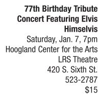 If you love the King, as in Elvis Presley, the King of Rock ’n’ Roll, you can celebrate his 77th birthday at the Hoogland Center of the Arts on Saturday, Jan. 7 with a tribute concert. Internationally-known performer Elvis Himselvis, also known as Rick Dunham of central Illinois, and his band take the stage. The tribute concert marks Dunham’s 27th year as an Elvis performance artist touring America, Canada and Europe. Dunham has been featured in the Chicago Tribune and USA Today, as well as television, radio and books. He is one-of-a-select-few to grace the King of Cards playing cards sold worldwide. Doors open at 6 p.m. when ticket holders can meet Olympic hopeful Lance Brooks and NHRA’s Tim Wilkerson. The concert will raise money for the nonprofit Mary Bryant Home for the Blind, located in Springfield.