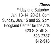 Laurie O’ Brien directs Springfield Theatre Center’s production of Chess, a musical with lyrics by Tim Rice and music by Bjorn Ulvaeus and Benny Andersson, formerly of ABBA. The story involves a romantic triangle between two top players, an American and a Russian, in a world chess championship, and a woman who manages one and falls in love with the other; all in the context of a Cold War struggle between the United States and the Soviet Union. The cast includes: Michelle Boone, Layne Roate, Kellen Fant, Jeff Prince, Aasne Vigesaa, Jim Leach, Kelly Trier and Willa Daniels. See also