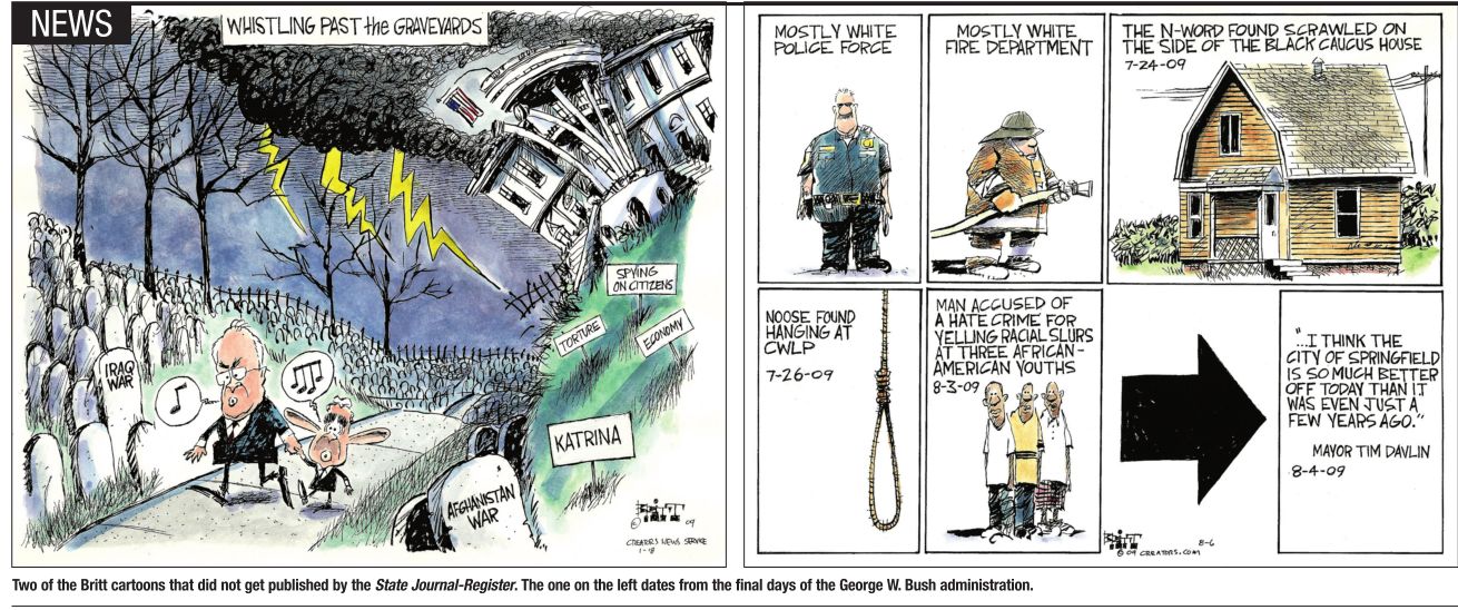 What started out two weeks ago as a bad cold has morphed into pneumonia, and his words come as croaks between coughs. The career of the State Journal-Register’s erstwhile political cartoonist, fired a week ago, is likely over, and Britt knows it.