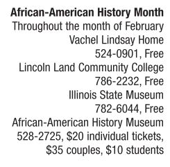 HISTORY | Vital visions Many local institutions are celebrating African-American History Month with activities in February. The Vachel Lindsay Home offers viewings of two films, Hallelujah!, one of the first MGM all-black films, on Feb. 4; and The Scar of Shame, a 1927 crime drama from the Colored Players Film Corporation, on March 3. Both shows start at 2 p.m. and require reservations by phone. Lincoln Land Community College features free events including a trivia game show on Feb. 6 from 11 a.m. to 1 p.m. and an African- American Food and Vendor Day on Feb. 22 from 10 a.m. to 2 p.m., both in A. Lincoln Commons. Children ages 4-8 and their families can learn about Illinois African-American musicians and make percussion instruments on Feb. 11 from 11 a.m. to 3 p.m. at The Illinois State Museum’s Super Saturday. The Springfield and Central Illinois African- American History Museum will host a Grand Opening Gala on Thursday, Feb. 23, 5- 7:30 p.m. at its location in the National Museum of Surveying with speaker Dr. Matthew Holden, Jr., refreshments and music. For more African-American History Month happenings or details, visit our calendar at illinoistimes.com/Springfield/events. See also