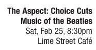 BAND SPOTLIGHT | The Aspect: Beatle Band Originally conceived as a way to bring several styles of popular music under one umbrella, Bill McKenzie’s concept group, The Aspect, continues the tradition by again taking on the Beatles as subject matter. The Lime Street Cafe venue adds to the ambiance with walls full of Beatle-related memorabilia as the Aspect members bring to life renditions of familiar and obscure Mop-Top covers. Fab Four fanatic and singing sensation Brian Curtis leads the way with stellar and stunning to-the-note versions of songs by the Liverpool Lads perfectly performed on the keyboard. Add into the mix dynamic guitarist and vocalist Jeff Helton, who claims, “these songs are in our DNA” with Mr. McKenzie on bass and vocals, plus Troy Roark enthusiastically personifying the “Ringo” drum sound, then top that off with Lori McKenzie bringing a female voice to the oft-heard man songs of the Beatles and you have a show to make Sgt. Pepper proud. As with all previous Aspect performances, anticipate Stump the Band, Beatle trivia, guest appearances and an overall celebration of the music at hand. See also
