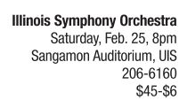 MUSIC | Harping on Concertgoers are in for a treat as critically-acclaimed harpist Bridget Kibbey plays with the Illinois Symphony Orchestra on Saturday, Feb. 25, at Sangamon Auditorium, UIS. “Ecstatic & Exotic Music” showcases the exotic sounds of Spanish serenades and ethereal bliss. Guest conductor is music director candidate Rei Hotoda, assistant conductor of the Dallas Symphony Orchestra, who was called “talented and poised with strong potential” by the Washington Post. Kibbey’s debut solo disc, Love is Come Again, was named by Time Out New York as one of 2007’s Top Ten Recordings. She has also been broadcast on NPR’s “Performance Today” and A&E’s “Breakfast with the Arts.” Pre-concert comments begin at 7 p.m. hosted by WUIS radio’s Karl Scroggin. Tickets can also be purchased two hours prior to performance. Read more at www.ilsymphony.org. See also
