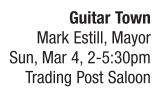 The first Guitar Town event held in 2008 featured 13 of central Illinois’ favorite guitar players playing, songs they liked for fellow guitarists. With a backline of Mark LeVault on bass and Bob Young on drums with Ric “Skippy” Major running sound, 2012 continues the tradition. “Mayor” Mark Estill came up with the idea after years of “playing out all the time and never seeing other guitarists” and instigated the show to allow gigging players the opportunity to visit and jam together. His vision spawned others to begin events celebrating other instruments, like Drumfest and Bassberg, but this is the original, invitation-only, with the public invited, guitar-slinging show. Previous performers include Rick Gasparin, Hank Helton, Jeff Helton, Michael Taylor, Chas Blythe, John Blythe, Hy Bunn, Jaigh Lowder, Mike Smarjesse, Allan Harris, Gwen Harris, Bill “Machine Gun” Evans, Roy Mathy, Gary Becker, Sam Crain, Frank Huston, Joe Cooke, Andon Davis, Mike Webb, Josh Hutchison, Dave Lumsden, Tim Wallis. 2012 guitarists include returning players, plus Tom Woolsey, Owen Irwin and others. Play on!!