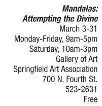 Matthew Schultz’s newest body of work will be on display at the Springfield Art Association through March with an opening reception Saturday, March 3, from 5:30-7:30 p.m. Shultz is a local multi-media artist and experimental musician whose exhibit will not only feature 30 of his more than 100 mandalas, but includes an accompaniment of his original soundtrack of the mandalic structure of sound and how it is represented in cymatics – the study of visible sound and vibration. Mandalas are considered sacred art in many religions. Recent research has shown that mandala meditation can assist in the healing process for cancer patients and those suffering from chronic pain or illness. Shultz hopes to expand the project with a DVD, book and medical therapy and research.