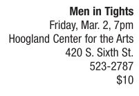 DANCE | Grand jetés Last year’s dance and musical extravaganza Men in Tights sold out, so get in on the action now by purchasing your tickets by phone or online from the Hoogland Center for the Arts. The Springfield Ballet Company once again has a new cast of local men who will perform for you Friday, March 2. They include: John Baker, Joel Benoit, Brent Borah, Matthew T. Dearing, Tom Frost, Dennis E. Frye, Jr., Dr. Jack Fyans, David A. Kelm, Brant Mackey, Randy Martin, MD, Kevin N. McDermott, Craig McFarland, Johnny Molson, Patrick Phillips, Joshua Ratz, Matt Ratz, Patrick Russell, Dug Shelton, Blake Stadel, Brian Stapleton and Kelly Trier. Each gentleman is raising at least $500 for the ballet company. You can donate in one of their names at www.springfieldballetco.org. See also