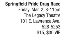 THEATER | Glam slam If you’re a RuPaul’s Drag Race fan, you’ll love Springfield’s first ever Drag Race put on by the Phoenix Center of Springfield and Springfield PrideFest 2012. Six winners of the night’s performances will be featured at the May festival. The VIP party begins at 6:30 p.m. with food, cash bar and live music by Josie Lowder. Then VIPs get upfront seating and backstage passes to meet the evening’s stars. Included in the lineup as of press time are: Jayla Carrinton, Jericha Knight, Sara Belle Knight, MaKena Murie Knight, J Estellado Knight, Lolita Vixen LaRouge, Morgan Michaels, Milaneyah Knight, Asianna Larough, Veer Pratap Singh, Latonya Manroe Michaels Larough, Honey Lamoore Cass and Ms. Stacy Ames. Tickets can be purchased at a reduced price before the show online at www.atthelegacy.com or at the Phoenix Center, 109 E. Lawrence Ave. All proceeds benefit Springfield PrideFest. See also