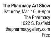 Ask anyone with a creative neuron in their noodle or an appreciation for spectacular art and the place to be Saturday night is The Pharmacy, at its second location, 1022 S. Pasfield, two blocks north of The Pharmacy studio. The March 10 warehouse exhibit features the work of fourteen members of this hip art colony, including local favorites Andrew Woolbright, Phil Ackerman, Barnabas Helmy, Felicia Olin and Jeff Williams. UIS professor Allison Lacher also has a guest installation. Warning: the space and presentation promises to be as impressive as the art. Ingest at your own benefit. More information and a sneak peek at some of the featured art can be found at thepharmacygallery.com or facebook.com/thepharmacygallery.