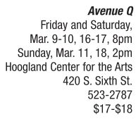This Tony-award winning musical features puppets, with their masters in full view, but don’t let the furry little guys fool you – these fellows are more like the older dudes on Fraggle Rock than the young’ns on Sesame Street. And their bite of sarcasm and realism makes this an adult-audience-only show. The story follows recent college graduate Princeton, who moves into a shabby New York apartment on Avenue Q littered with interesting characters who in the end help him find his purpose in life. Members of the local cast trained for weeks to hone their puppetry skills. They include: Nathan Peak as Princeton, Allison Campbell as Kat Monster, Ralph Shank as Trekkie Monster and Vanessa Ferguson as Lucy the Slut. Mac Warren directs. Sponsored by ADHD Productions, Corporation Service Company, 99.7 KISS FM and 96.7 The BOSS.