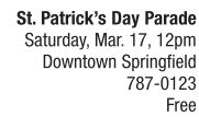 PARADE | Irish fête The luck of the Irish, or at least the green, descends on downtown Springfield during the St. Patrick’s Day Parade Saturday, March 17, at high noon. The parade is emceed by Amie Menenghetti of COOL 101.9 and Liz Willis of 100.5 WYMG who are stationed at the reviewing stand in the family friendly area on Sixth Street. Parade marshals, The St. Andrew Society of Central Illinois, will be accompanied by almost 100 entries, including floats, school bands, radio personalities, Ansar Shriners clowns and cars, police and fire departments and more. The parade route snakes from Horace Mann on Jefferson, west to Fifth Street, south to Capitol Ave., then north on Sixth Street, and east on Washington Ave. More info can be found at www.springfieldirish.org. See also