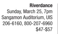 DANCE | Gem of a journey After 16 years, the internationally-acclaimed show Riverdance is hanging up its stepdancing shoes. Don’t miss the last dance in Springfield, March 25 at Sangamon Auditorium, UIS. The ensemble’s “The Farewell Tour” touts the energizing and awe-inspiring Irish dance, music and song with an amazing cast of accomplished dancers accompanied by a five-piece band. If you’ve never seen the show, an interesting scene by scene synopses can be found on the group’s website at www.riverdance.com. See also