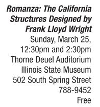 FILM | All the right moves Sunday, March 25, is the Central Illinois premiere, and national tour kickoff, of the film Romanza by director and producer Michael Miner. The 87-minute documentary captures the complete Golden State works of Frank Lloyd Wright, with unprecedented access to all 25 buildings. Even his unfinished structures are featured in this movie, as is his smallest design, a doghouse, for his youngest and poorest client, a child. Two viewings are set, one at 12:30 p.m. and another at 2:30 p.m. Miner will introduce the film and take questions following its showing. A replica of the doghouse, named Eddie’s House, will be on display along with copies of the original plans and correspondence. Miner’s other Frank Lloyd Wright films are Sacred Spaces and Children of the Sun. The Dana-Thomas House Foundation and Springfield Section of the American Institute of Architects sponsor this free and fascinating event. See also
