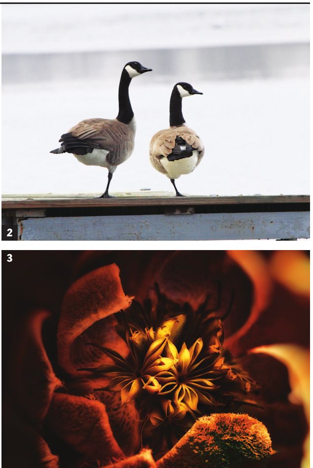 First place, Deb Perschbacher of Pawnee for “In Stride.” Perschbacher caught this interesting shot of a bug crawling on a window in Pawnee. Second place, Liz Bennett Cheek of Spring Lake for “And They Said We Didn’t Have a Leg to Stand On.” Liz caught a pair of geese in a precarious pose on a dock in Tazewell County. Third place, Adam Smith, Springfield. “Ambient Intimacy” is all about shadows, available lighting and angles. Smith adds, “The flower symbolizes beauty and lighting symbolizes intimacy.” continued on page 14 See also