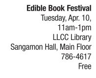 It’s free to enter and free to sample the entries. Lincoln Land Community College Library invites you to participate in its Edible Book Festival. Create your best book or book-related item out of food. Use your imagination and make a cake or sandwich or sushi or cheese display and give it a fitting name, such as, The Scarlet Cheddar. Any skill level or age is invited to join in. Groups are also welcome. Edible books will arrive at the library between 7:30-11 a.m. and be displayed until noon. From 11 a.m. to noon, the public will vote on its favorites, with prizes for two top vote-getters. The public is also invited to eat the creations following.