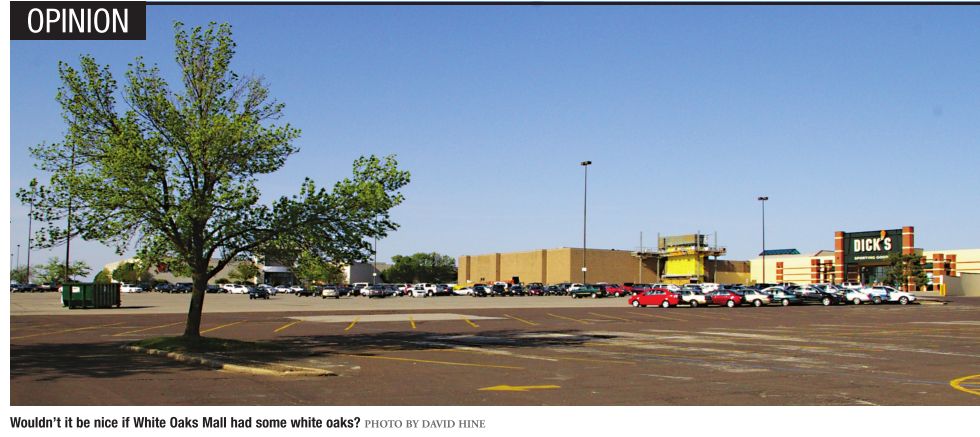 I think that I shall never see a car park lovely as a tree. Not in Springfield anyway. You’d have to travel to the Gobi to see expanses of treeless terrain to match the city’s larger parking lots. At White Oaks Mall, for instance, the mall’s southwest lot boasts 13 smallish trees on the perimeter of a space that accommodates a few more than 700 cars, each of which is baked to a turn on a bright day. There are not enough trees to house even one family of starlings along the entire length of Wabash. The developer’s name notwithstanding, no sap flows on the lots built to serve Leonard Sapp properties along Chatham Road. Downtown, at the Horace Mann lot north of the headquarters, falling limbs pose no casualty risk to parkers, there being not one tree on that whole city block. There are many, many other examples.