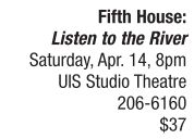 MUSIC | Illinois River University of Illinois Springfield - Sangamon Auditorium presents Listen to the River, Saturday, April 14, at 8 p.m., as part of the UIS Kitchen Sink Series in the UIS Studio Theatre. The performance is a collaboration between the Chicago-based woodwind quintet Fifth House Ensemble and the Department of Environmental Studies at UIS and the Therkildsen Field Station at Emiquon. The tale of the Illinois River will be told through chamber music, stories and photographic images. Tickets can be purchased at www.sangamonauditorium.org, where you can also learn more about the event. See also