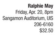 One-of-the most popular and beloved comedians in the country pounds into Sangamon Auditorium, UIS this Friday, April 20. Ralphie May is on his Too Big to Ignore tour. Don’t ignore this show. After debuting on season one of “Last Comic Standing,” May was voted one of Variety’s 10 Comics to Watch. With no subject off limits, he pumps out cracks about politics, race and other matters that many would not touch. But May has the knack of making anything funny. That’s why all his shows are sold out.