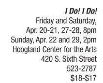 THEATER | Wedded bliss Gus Gordon and Cynda Wrightsman play Michael and Agnes in the musical comedy, I Do! I Do! The story of a couple’s 50-year marriage runs for six performances at the Hoogland Center for the Arts over two weekends. Written by Harvey Schmidt and Tom Jones, who also wrote The Fantasticks, the local production includes the song, “My Cup Runneth Over” and is directed by Paul Presney, Jr. with Damien Kaplan and Jane Hartman on piano. Visit www.hcfta.org to purchase tickets for an opening night pre-show dinner on April 20 or a special Mother’s Day dinner theater performance on May 13. See also