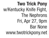 Using Elvis Presley, Patsy Cline, Johnny Cash, Chuck Berry, the Beatles, the Crystals and Buddy Holly from days of yore, plus a mishmash of more modern cuts from the Ramones and the Misfits, Two Trick Pony forges a special place in the Springfield music scene by converting classic tunes into fuzz guitar-driven, punkish sounding anthems. Founded when singer/guitarist Bernie Flesch (Zombots, Sonny) moved back to Springfield in 2010 and began searching for members to make a “50s punk, cover band,” he first hooked up with a steady drummer in Mat “1T” Hames (Incontinent Havoc, Sminners). Soon the lineup solidified with Kyle “KC” Jones (Merkins, Electric Dynamite) on bass, Matt “Woo” Natale (Boon, Go! Tsunami) on lead guitar and Brittney Franklin (Beverly & the Overloads, Big Fur) on lead vocals. Only a few months into playing out, the band came up with a bunch of originals they described as, “Punktry Western & Rockabilly,” with a fulllength, self-produced album of the material scheduled for a 2012 summer release.